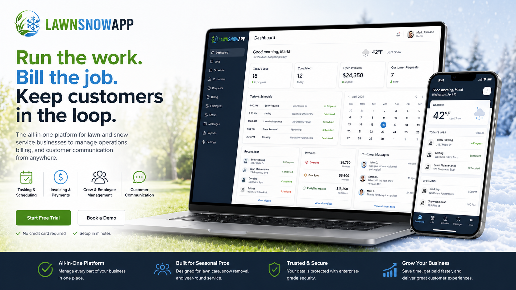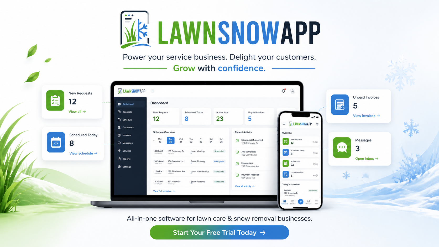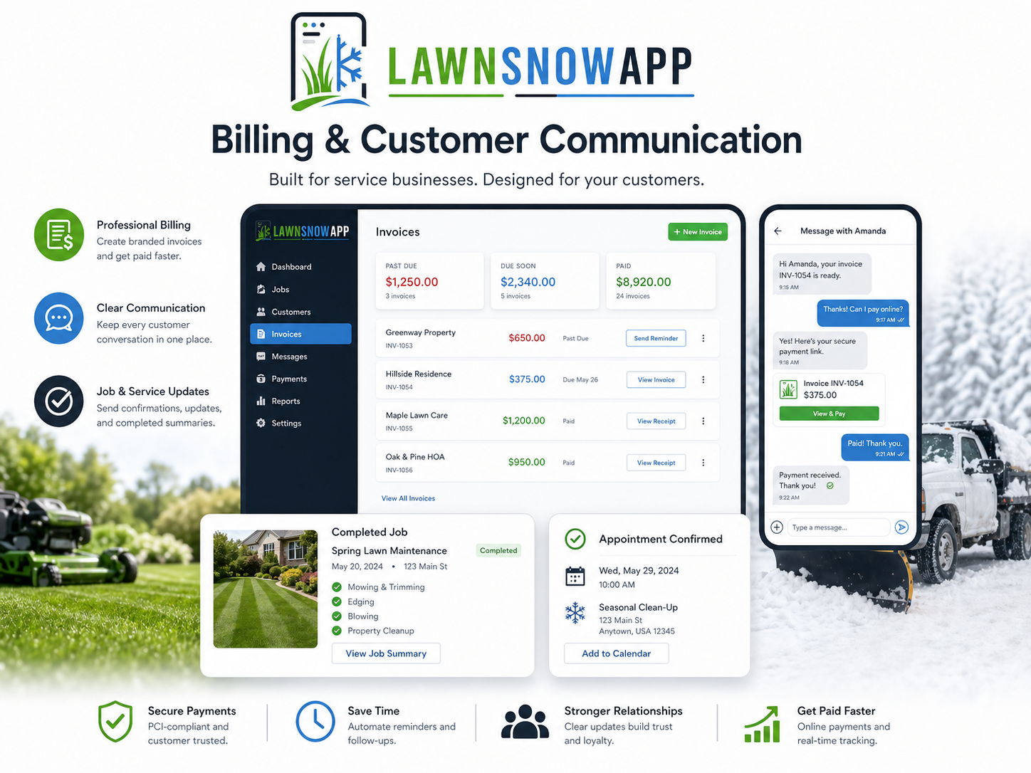 LAWNSNOWAPP helps lawn, snow, and seasonal service businesses manage jobs, crews, billing, customer requests, and communication from one clean dashboard.
